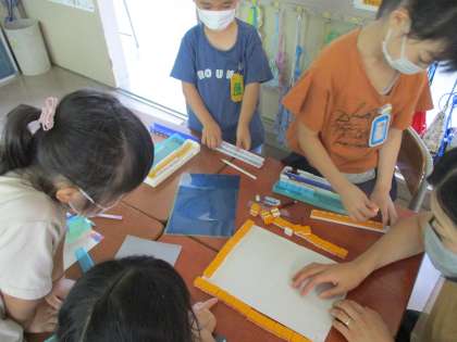 算数ブロックを使ったり、紙を折り曲げたり、長さを紙で記録したりと色々な方法で長さを比べていました。友達と協力して、一生懸命考える姿が素敵でした。