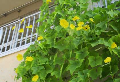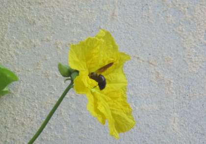 学校の花壇にヘチマがたくさん咲いています!ハチもお仕事をがんばっています。