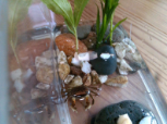 僕は、カニなど生き物についての知識はあまりないので、石などを入れて、できるだけ自然に近い環境を作ってみました。このあと砂などを敷こうかなと考えています。弟と一緒に大切に育てていきたいです。