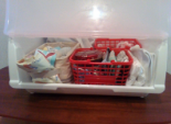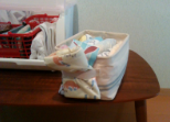 わたしは、部屋の整理整頓を工夫してやってみました。工夫したところは、2つです。1つ目は、カゴを使ったところです。種類別に分けて入れました。2つ目は、軍手を袋に入れると、中身が見えなくなってしまい、何が入っているかわからなくなってしまったので、ふくろに「グンテ」と刺繍をしたことです。