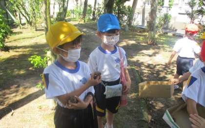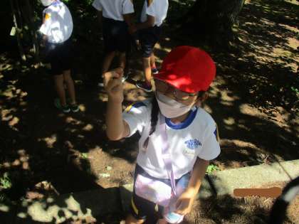 「あき みつけ」をしました。まつぼっくりやどんぐり、イチョウの葉など、色んなものを発見していました。