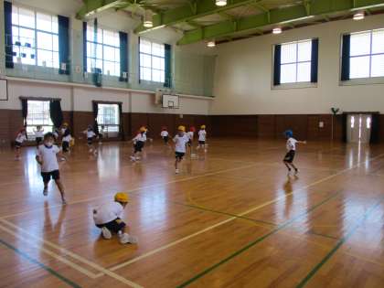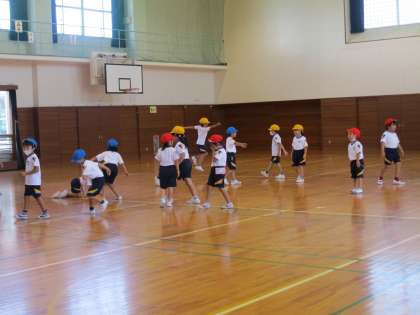 音楽に合わせて体を動かしました。素早く走ってみたり、スキップしてみたり、うつむいてゆっくり歩いてみたり、曲想に合わせて表現しました。がんばっています・・・
