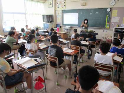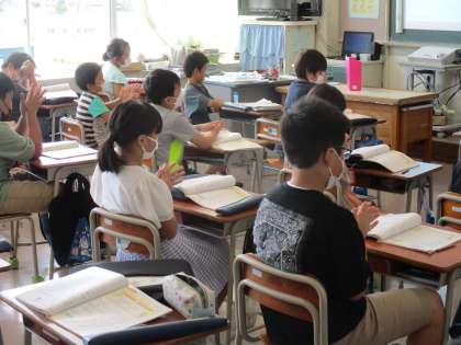 曲のリズムに合わせて手を叩いています。リズムよくたたこうを音楽をよく聞いて学習に取り組んでいます。