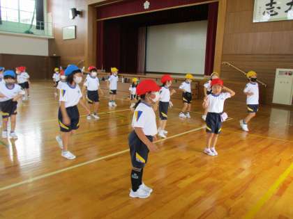 スポーツ係さんがみんなの前に立って、準備体操をがんばっています。