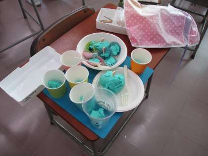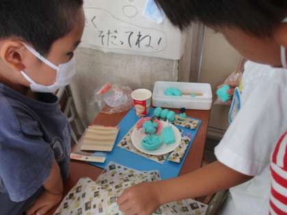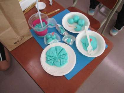 ラーメンやケーキ、お寿司など、いろんなごちそうを粘土で作りました。 おいしそう〜