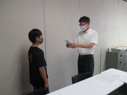 夏休み中、野球の全国大会に出場し優勝した児童に、天瀬っ子応援団からのお祝いが渡されました。