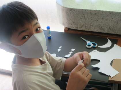 今日は図工の時間に、黒色と白色の画用紙を使って作品を作りました。画用紙を切ってできた形から想像を広げ、自分の表したい世界を表現しました。