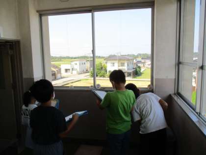 学校で昼間の月が見つかり、観察しました。子供たちは月について様々な予想を立てていました。