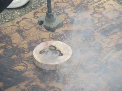 切って磨いた木片に・・・焼き印!