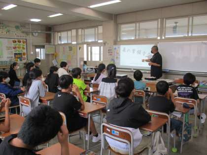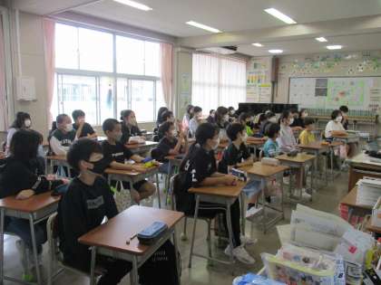 6年生は宿泊で常願寺川について学びます。今日は、宿泊学習当日にすることを聞いたり、昔の暴れていた常願寺川の話をきいたりしました。