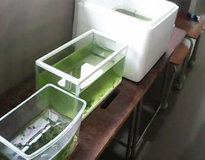 6年生教室ではメダカを飼っています。メダカは、すくすく元気に育っています。メダカが卵をうみ、子メダカもいます。(見づらいですが、写真下 に写っています。)見てみたい人は6年生教室(音楽室)まで来てください。