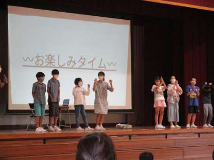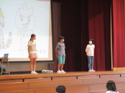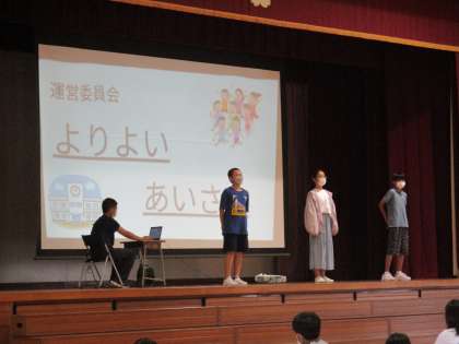 今日の児童集会は運営委員会と運動委員会の発表がありました。運営委員会は「あいさつ」についてみんなに振り返ってもらおうと考え、劇やクイズにしました。みんなのこれからの生活に生きるといいですね。