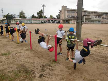 友達と声をかけ関わり合いながら、共に鉄棒名人を目指しています。