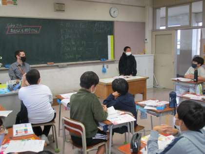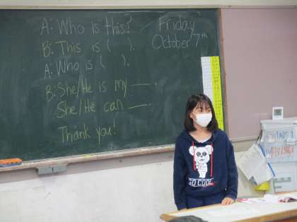 外国語の学習では、習った表現を用いて、一人一人が発表を行いました。紹介したい人や物をカードに描いて、クラスのみんなに紹介します。家族のこと。友達のこと。飼っている動物のこと。楽しい発表の数々でした。