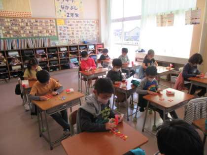 おはじきを使ってかけ算を表しました。