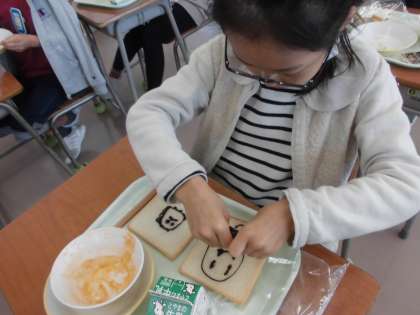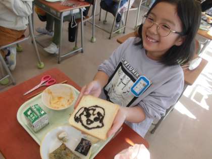 食パンにチョコクリーム付きです。 描いちゃいますね。笑みがこぼれます。