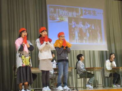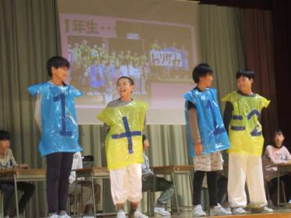 6年生の発表は「劇 新解釈 日本史☆」ですプロローグは教室の場面です。これまでの自分たちの歩みを振り返っています。