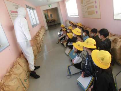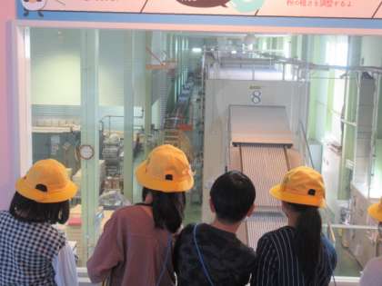 大きな機械や、せんべいが出来上がるまでの様子に興味津々です。