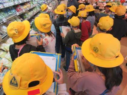 次は、スーパーマーケット見学です。 売り場の工夫をたくさん教えていただきました。