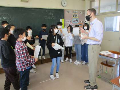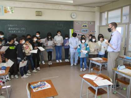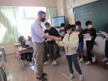 外国語の学習で、場所を尋ねたり答えたりする表現を学びました。教室を「Town(タウン」に見立てて、練習しています。体を使って、楽しく学習しています。