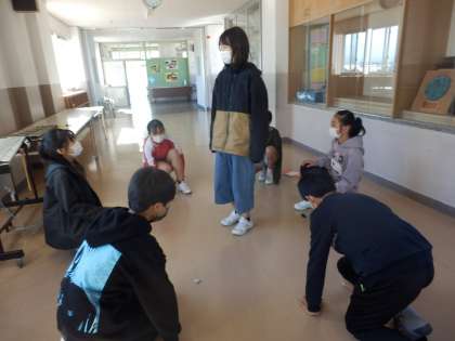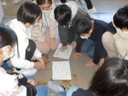 国語で、三校交流会の雨の時にするミニゲームを考えて、実際にできるかやってみました。私たちのグループは双六です。やってみた結果とてもよく、特に問題点は見つかりませんでした。三校交流が楽しみです。