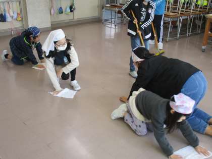 雑巾の使い方を教えてもらいながら、1年生も掃除しています。