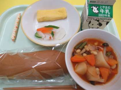10日(木)今日の献立 公開日 2022/11/10 更新日 2022/11/10 給食室 ・黒糖コッペパン ・牛乳 ・卵ロール ・大根サラダ ・ポークビーンズ ・棒チーズ ※11時45分、検食終了。異常ありません。 赤・黄・緑・白色と、彩り鮮やかに出来上がっています。