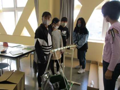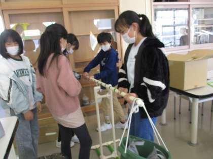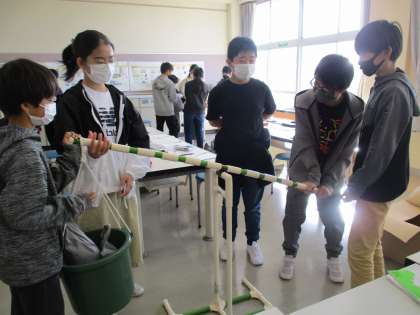 6年生理科は、てこを使った学習です。今日は、力点と支点の距離や作用点と支点の距離を変えて、手応えを比べてみました。