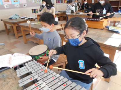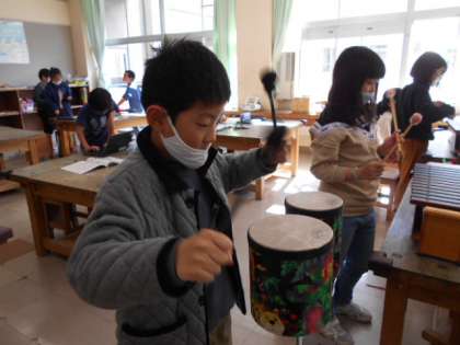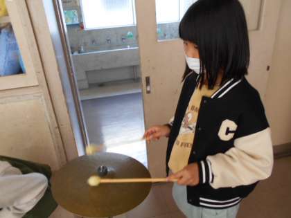 「まほうの音楽のもと」をつくっています。いろいろな鳴らし方を試しながら、イメージに合う音色や響きを探しています。