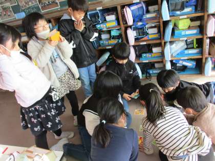 にぎやかな生活科室をのぞいてみると、、、 みんなで「かるた大会」をして遊んでいました。