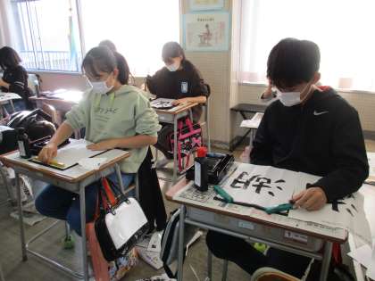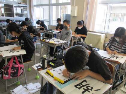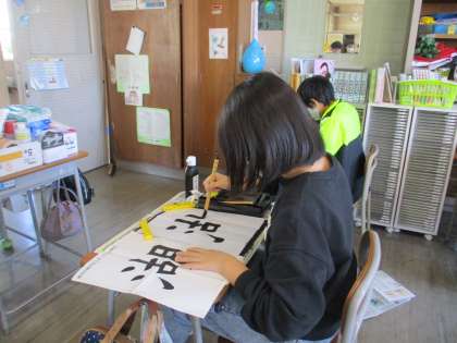 「湖」2回目です。集中して書いています。もうそろそろ、書き初めの練習も開始します。長い下敷きや、新聞紙をつなげた敷物が必要ですね。準備しておきましょう。