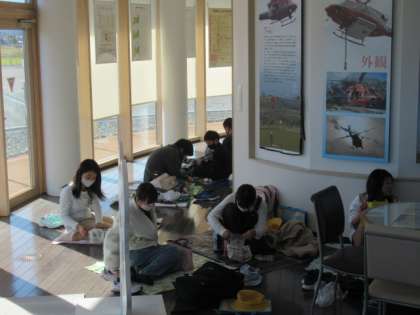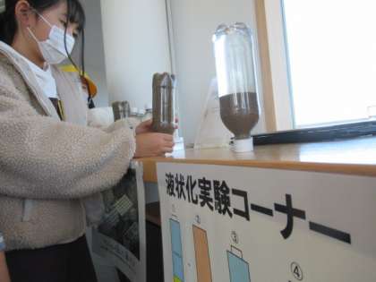 昼食は、四季防災館の3階で食べました。3階からは、美しい立山連峰を見ることができました。また、災害時に起こる液状化現象を体験できるコーナーも子供たちに大人気でした。