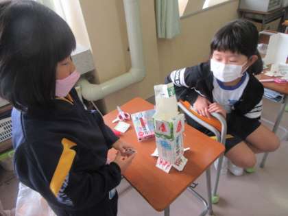 今日は、この前、作り方を知った「ぴょんぴょん○○」のパワーアップをしました。友達と協力しながら自分なりにパワーアップができました。