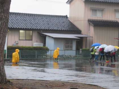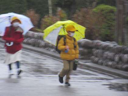 子供たち、がんばって登校してきます・・・ 上空には、鷺(さぎ)?