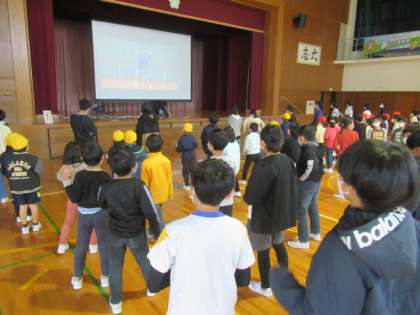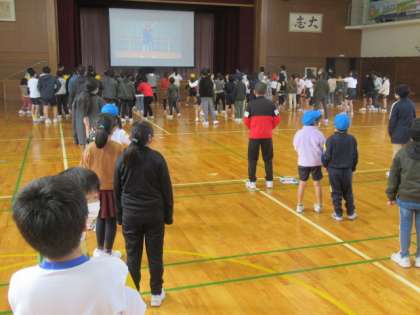 毎週水曜日、大休憩に全校児童が運動をして体力を高めています。今日は、体育館でダンスです。がんばっていました。