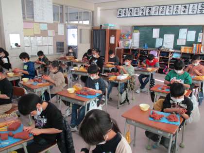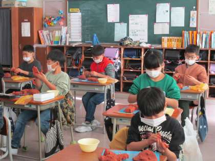 図画工作でクレイ粘土を使用して、シーサーを作成しました。子供たちは、思い思いのシーサーを作成していました。