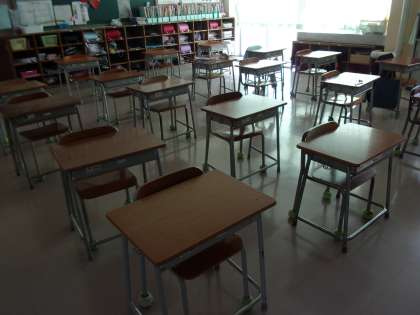 子供たちが体育館へ行った後の教室。机や椅子がしっかり整頓されています。はやる気持ちもあったでしょうが、さり気ない気遣いがすてきです。