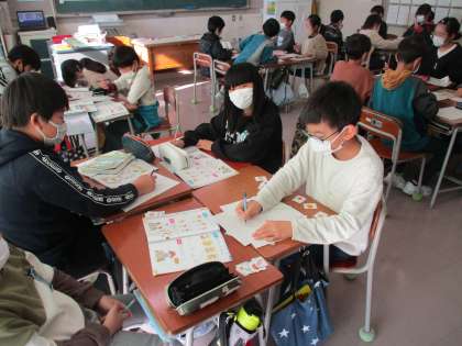 友達の作りたいパフェを英語で聞いて、用紙に書きました。フルーツの種類や数について質問していました。