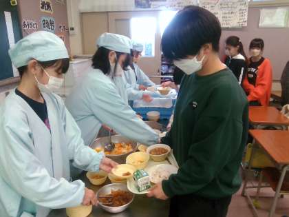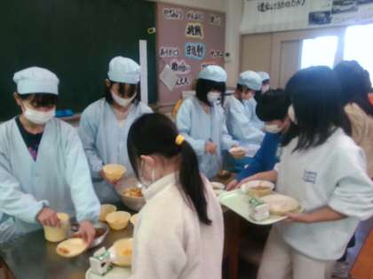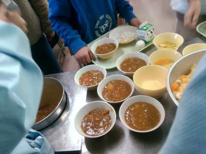 今日の献立は、カレーライスとフルーツポンチです。食べる前から、ウキウキの子供たちです。