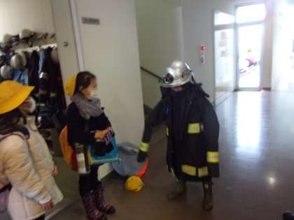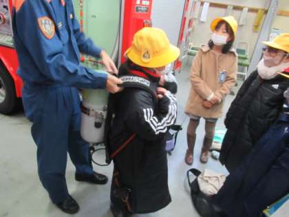 ホースやボンベ、防火服を持たせてもらいました。重さにびっくりです。