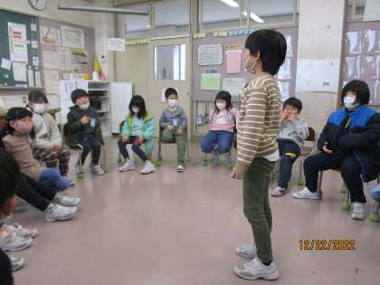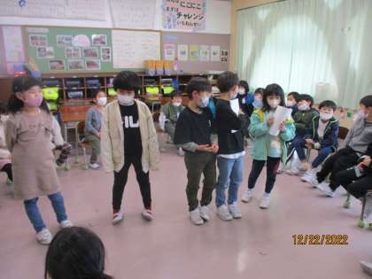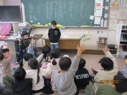 1年生 お楽しみ会 公開日 2022/12/22 更新日 2022/12/22 1年生 「ハンカチ落とし」や「フルーツバスケット」「〇×ゲーム」など、みんなで楽しい活動をしました。 お楽しみ係が準備をがんばりました。始めの言葉や終わりの言葉、ルール説明、プログラムを考えました。 終わった後は「楽しかった!」という声が多く、お楽しみ係もうれしそうでした。