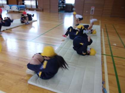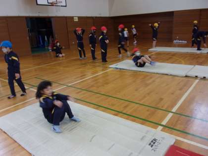 マット運動の学習がスタートです。前転をしたり壁上がり倒立をしたりしました。