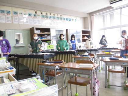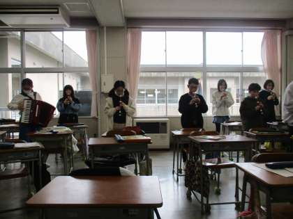 今日の音楽の時間に、合奏の演奏会に招待してもらいました。「風を切って」という曲だそうです。木琴や鉄琴、アコーディオン、リコーダー、たくさんの打楽器の息がピッタリとあった素敵な演奏でした。