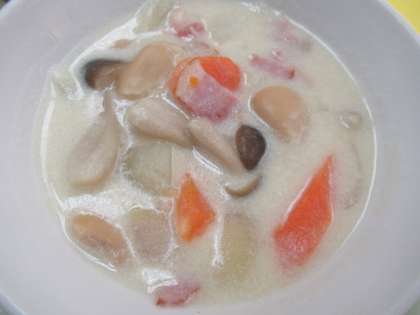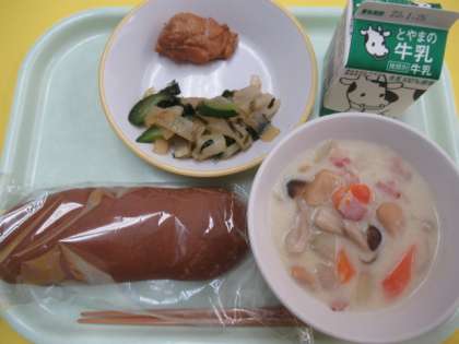 19日(木)今日の献立 公開日 2023/01/19 更新日 2023/01/19 給食室 ・ココアコッペパン ・牛乳 ・照焼きチキン ・海藻サラダ ・豆ときのこのクリーム煮 ※11時45分、検食終了。異常ありません。 クリーム煮の中に、長さ3cm程の大きな豆が入っています。 「白花豆(しろはなまめ)」だそうです。