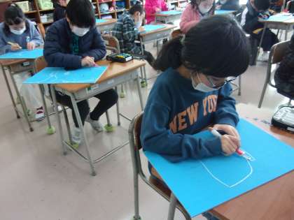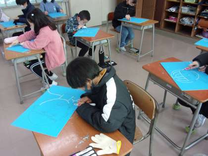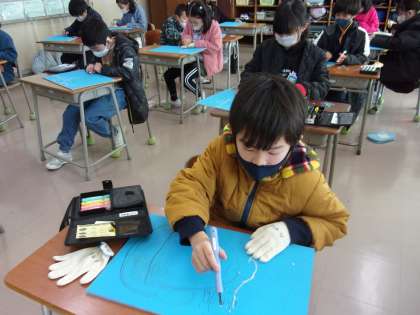自分の顔を彫り始めました。安全に気を付けて、集中しています。