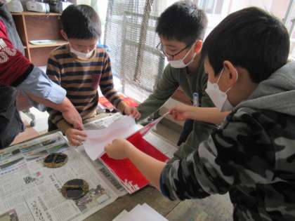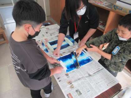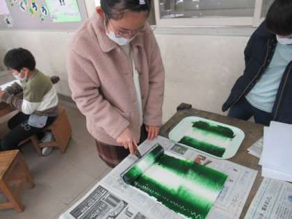 版画の背景を作っています。自分の動物のテーマに合わせて、色を決めて背景をすりました。