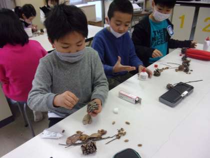 環境委員会企画のイベントです。学校で集まった、まつぼっくりやどんぐりなどを使って工作しました。なかなかすてきな作品ができました。