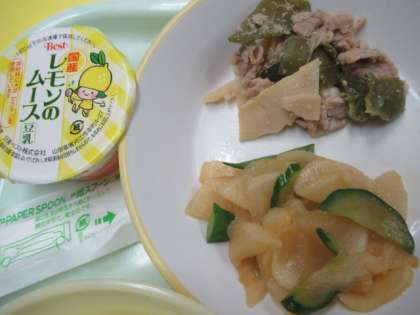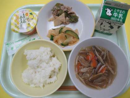 25日(水)今日の献立 公開日 2023/01/25 更新日 2023/01/25 給食室 ・ごはん ・牛乳 ・ピーマンマンの炒め物 ・レモンムース ・かぶの中華和え ・春雨スープ ※11時45分、検食終了。異常ありません。 「給食週間」3日目。 今日は「ピーマンマンと夜ふかし大まおう」に関係するメニューです。 ピーマンマンとレモンたち、給食を食べて、夜ふかし大まおうをやっつけよう。