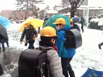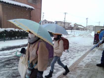 降りしきる雪の中を子供たちは帰っていきました。降雪中、くれぐれも安全に気を付けて登下校してください。そして、明日も元気な顔を見せてね!