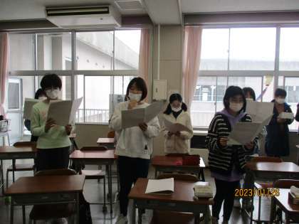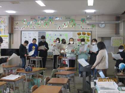卒業式に向けて、卒業式で歌う歌の練習を少しずつ始めています。音楽担当の先生に音をとってもらいながら、2部合唱になるように練習中です。